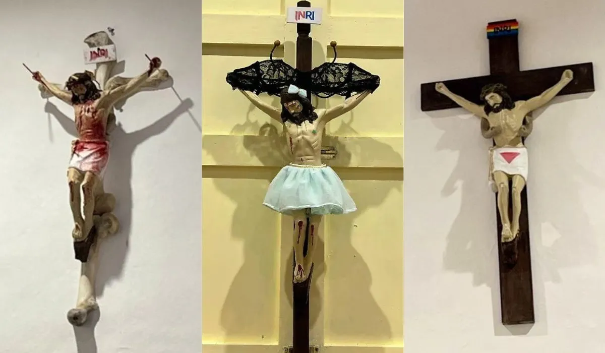 Hay desde un Cristo encadenado y lleno de heridas, hasta otro con tatuajes, pasando por uno vestido con símbolos de la comunidad LGBT, o uno acompañado de coronas hechas con balas y tampones.
