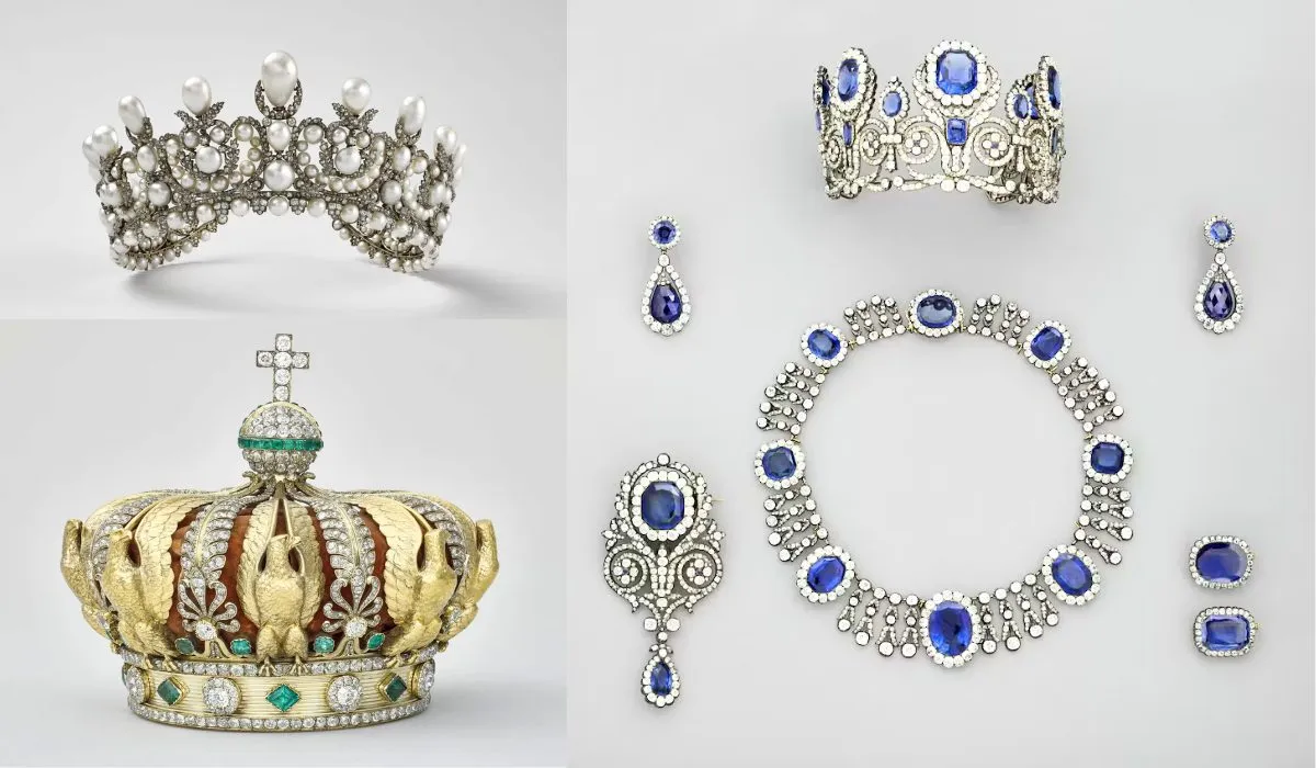 Las joyas datan del siglo XIX y están compuestas por miles de diamantes, zafiros y esmeraldas, trabajadas con una precisión que refleja la maestría de los artesanos franceses.